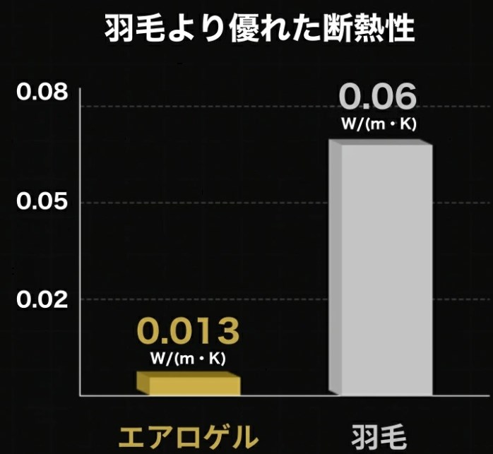 断熱素材 | エアロゲル(空気80%以上) | ダウン(羽毛)など |