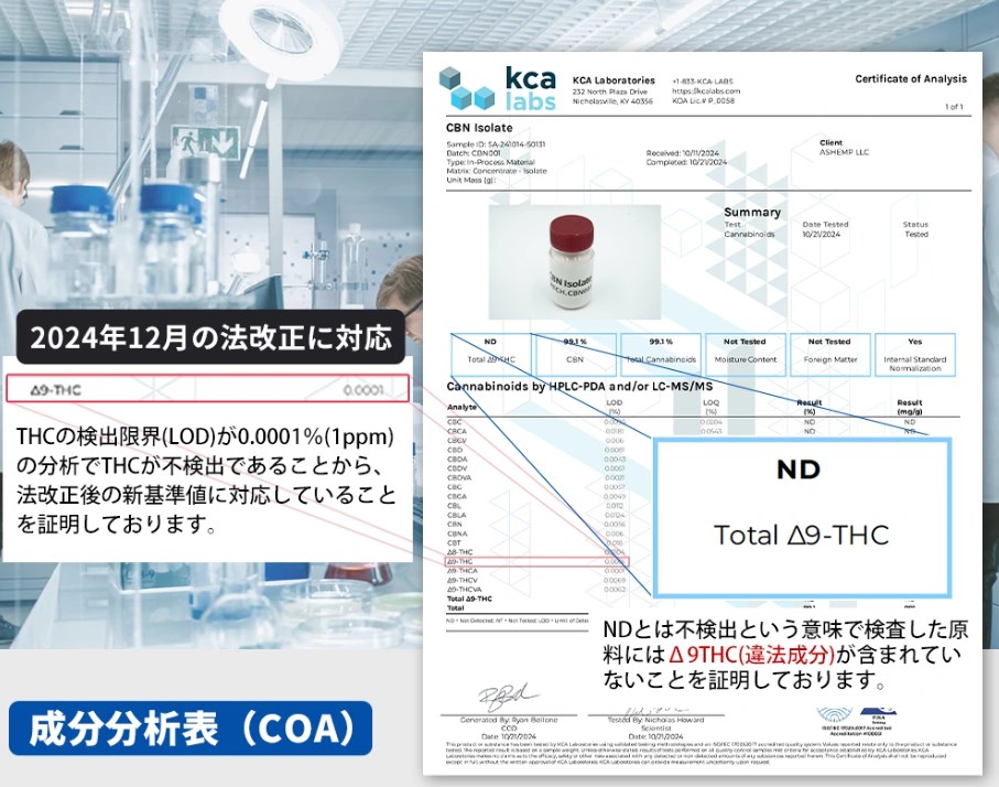 特にスイス産のアイソレート原料は、日本のTHC基準を満たすよう再結晶化処理を行い、高純度かつ有害物質を完全除去。