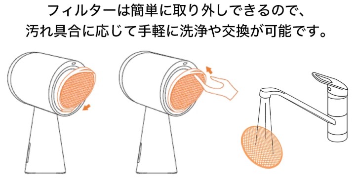 - 定期的なケア:フィルターを外して、中性洗剤で洗浄。乾燥させて再装着するだけです。