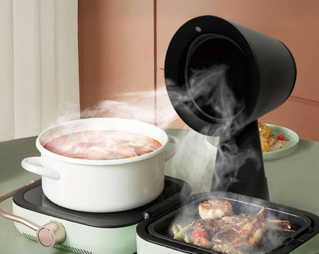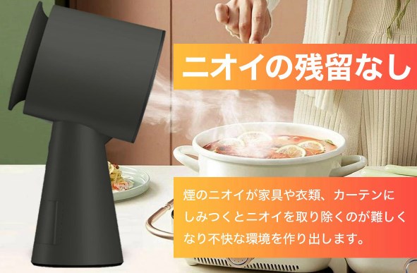 この製品は、調理時に発生する油煙をその場で強力に吸い取り、空気をきれいにして排出する卓上型のコンパクト換気扇です。