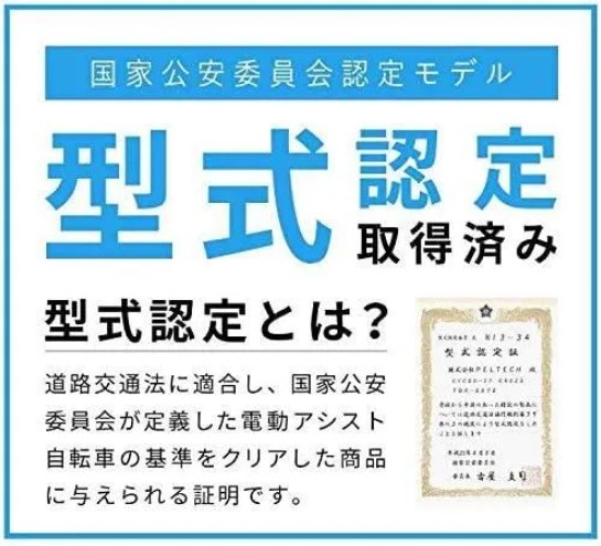 型式認定とは、国家公安委員会が、道路交通法令に定められた基準に適合した自転車であることを認定する制度です。PELTEC LOWSTEPは、駆動補助機付自転車(電動アシスト自転車)として認定された「TSマーク」対応です。