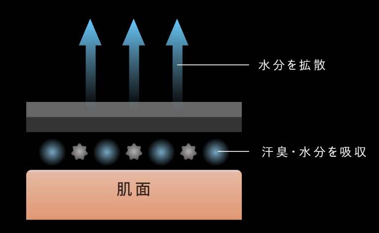 通常の活性炭にも吸着力はありますが、Triporous™は多孔構造によって、より広範囲かつ高速で体臭成分を吸着できるんです。